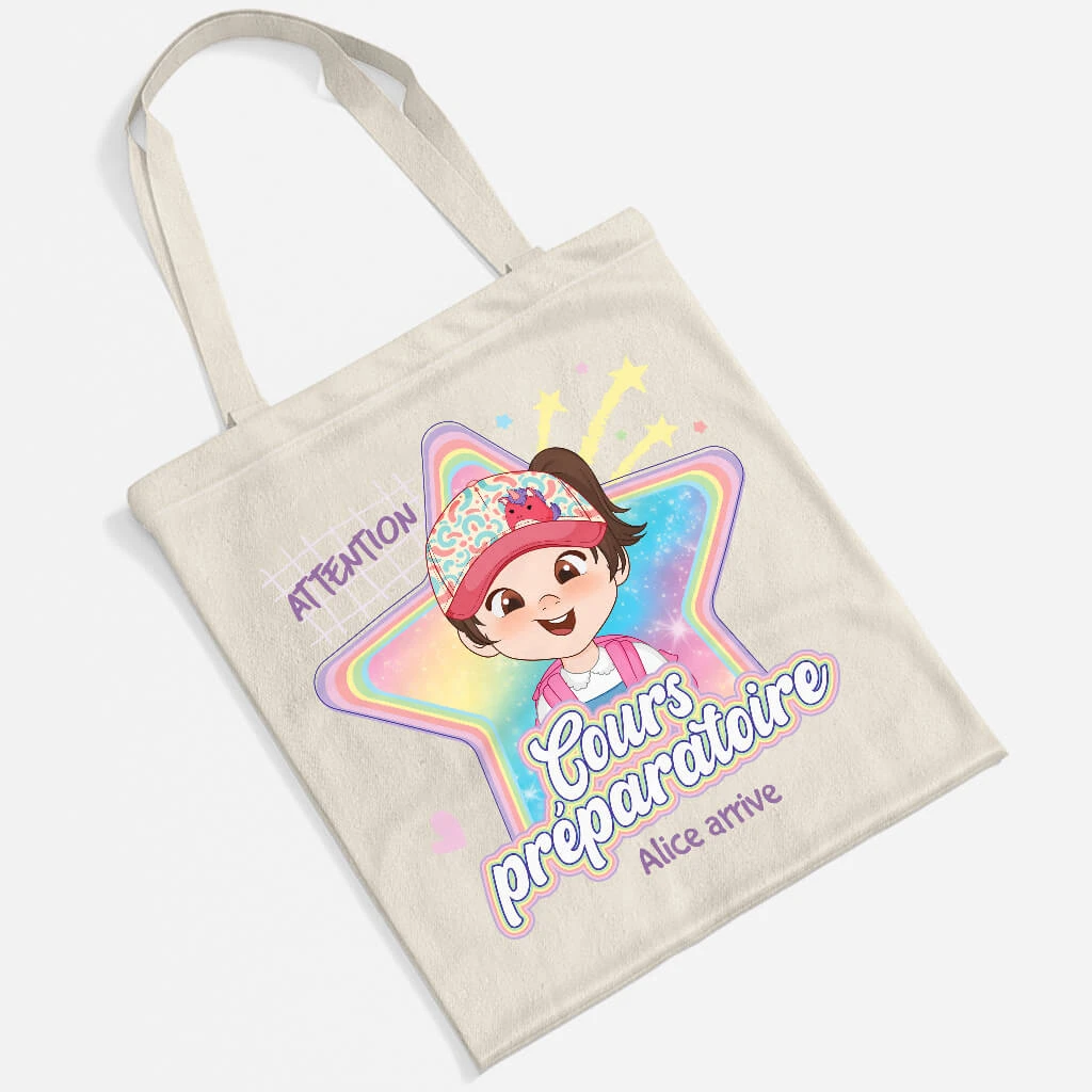 Faites une rentrée pleine de fierté et de couleurs avec ce tote bag personnalisé maternelle orné d’une illustration adorable et du prénom de votre enfant. Avec son grand motif étoile irisée et la mention “Attention Petite Section – [Prénom] arrive”, ce sac personnalisé rentrée scolaire devient un vrai symbole d’entrée à l’école !