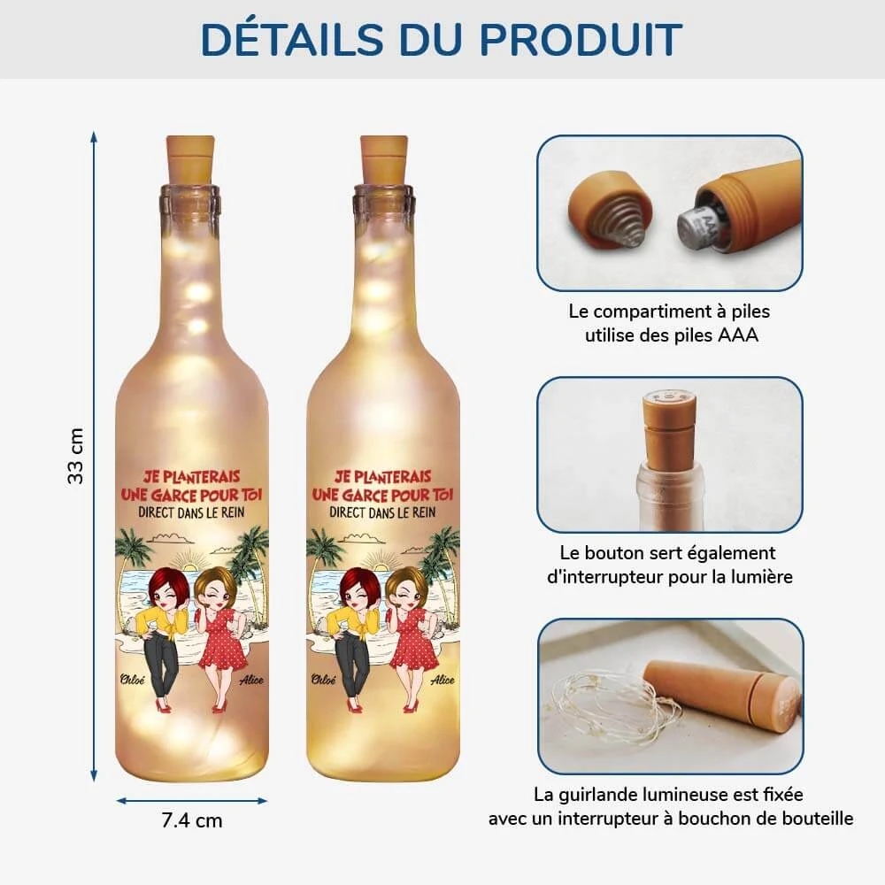 Mettez de l’éclat dans votre amitié avec cette bouteille lumineuse personnalisée et sa citation amitié drôle qui fera sourire à chaque regard. Parfaite comme idée cadeau personnalisé pour une meilleure amie, cette lampe décorative mêle humour, tendresse et style.