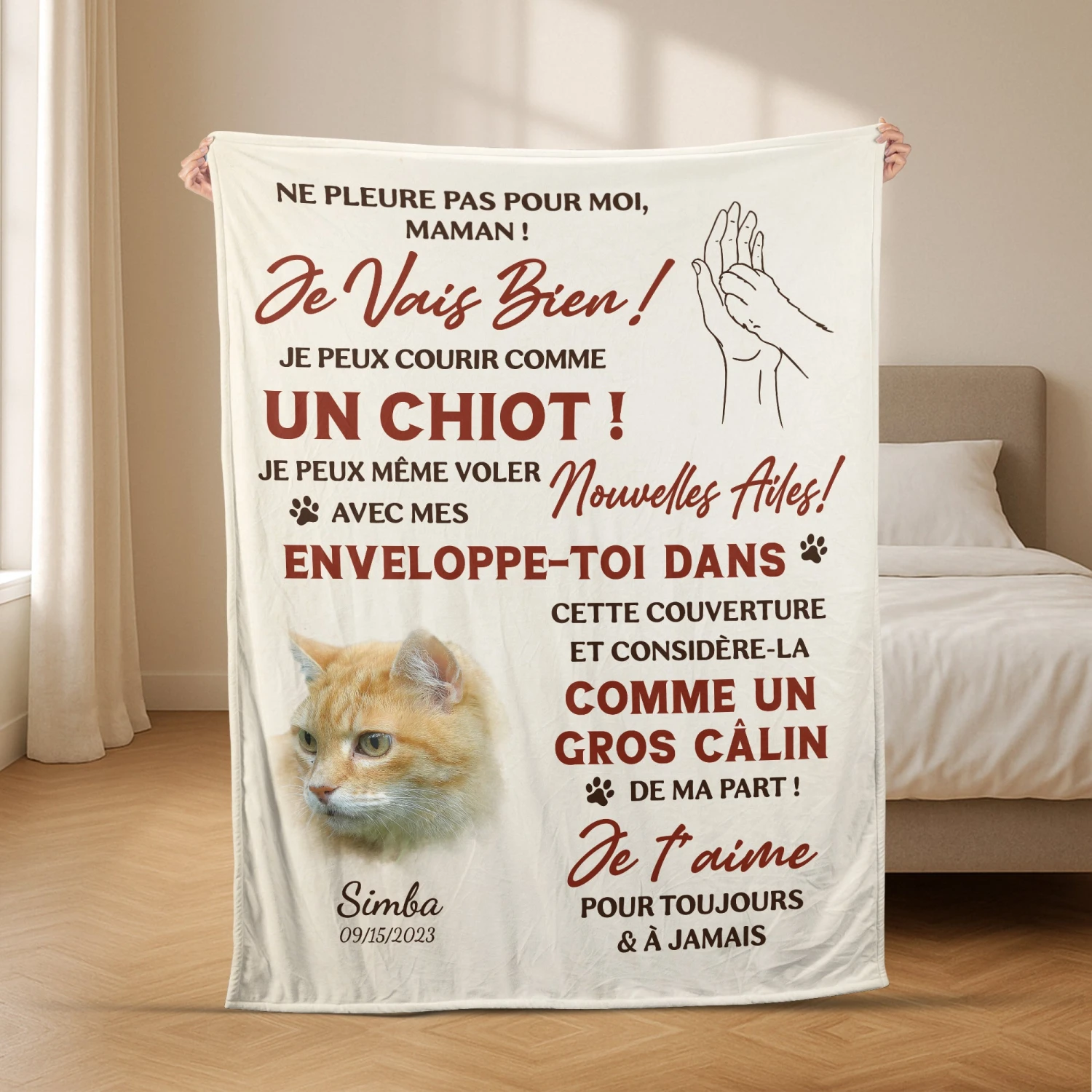 Ajoutez la photo et le prénom de votre fidèle ami pour créer une couverture souvenir douce et réconfortante. Ce plaid devient un lien apaisant avec votre chien, à garder près de soi à tout moment.