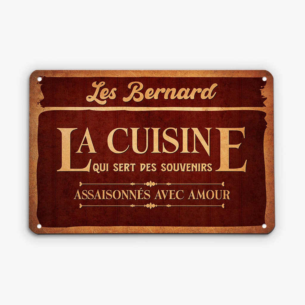 Faites de votre cuisine un lieu de partage et de nostalgie avec cette plaque en métal personnalisable, portant l’inscription “La cuisine qui sert des souvenirs”.