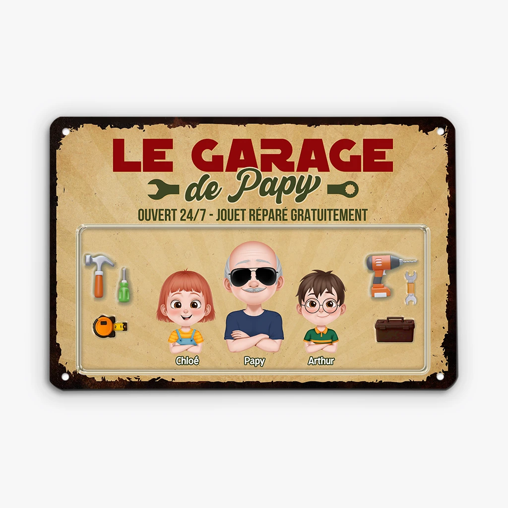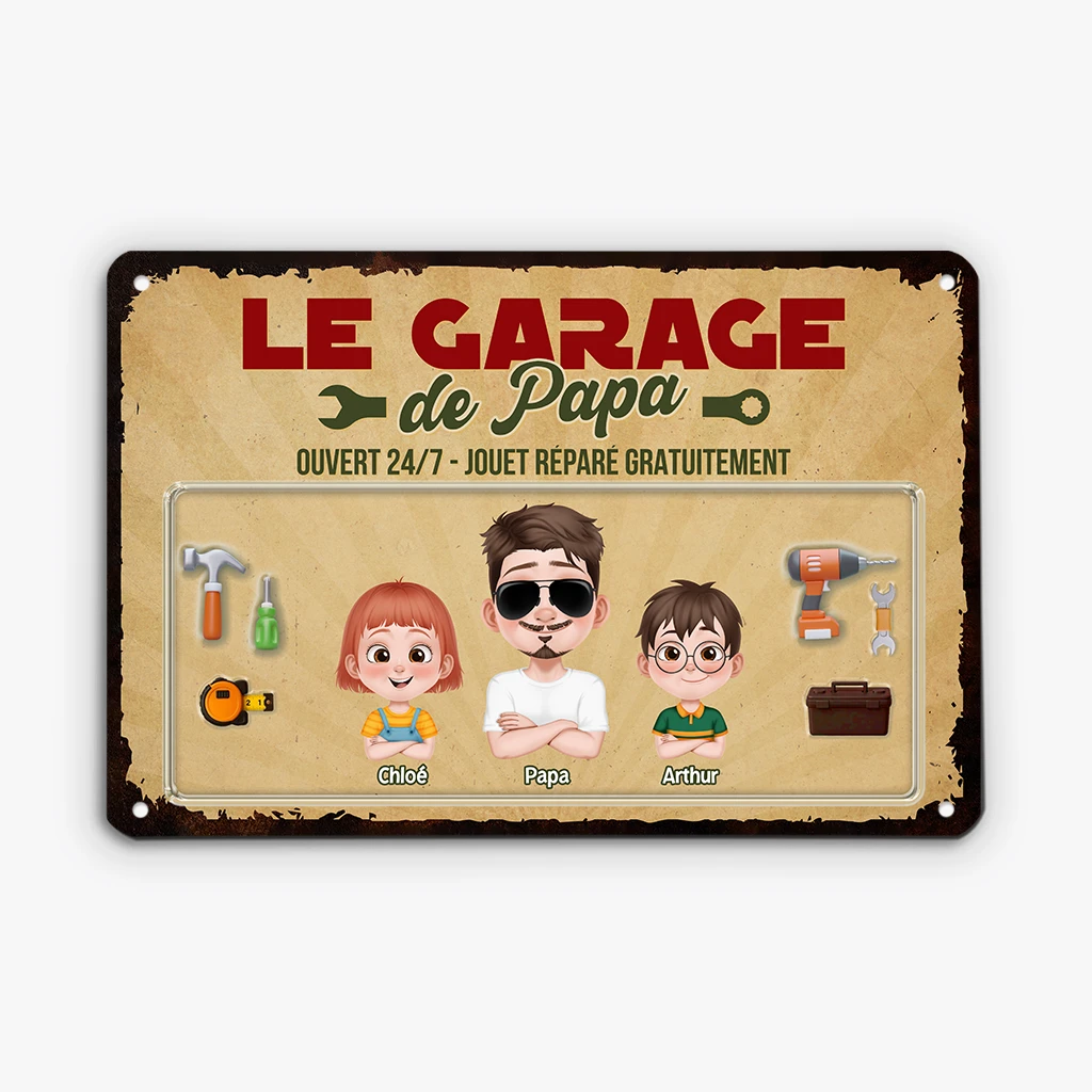 Cette plaque garage fête des pères attire l’attention par son design cartoon amusant et sa personnalisation possible. Elle met à l’honneur l’univers mécanique et l’humour tendre des papas bricoleurs. Une plaque garage personnalisée qui combine parfaitement utilité et originalité.