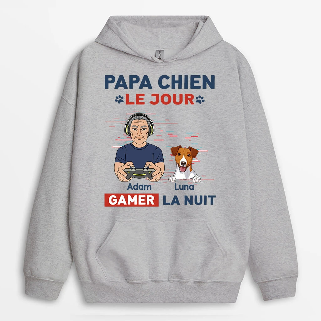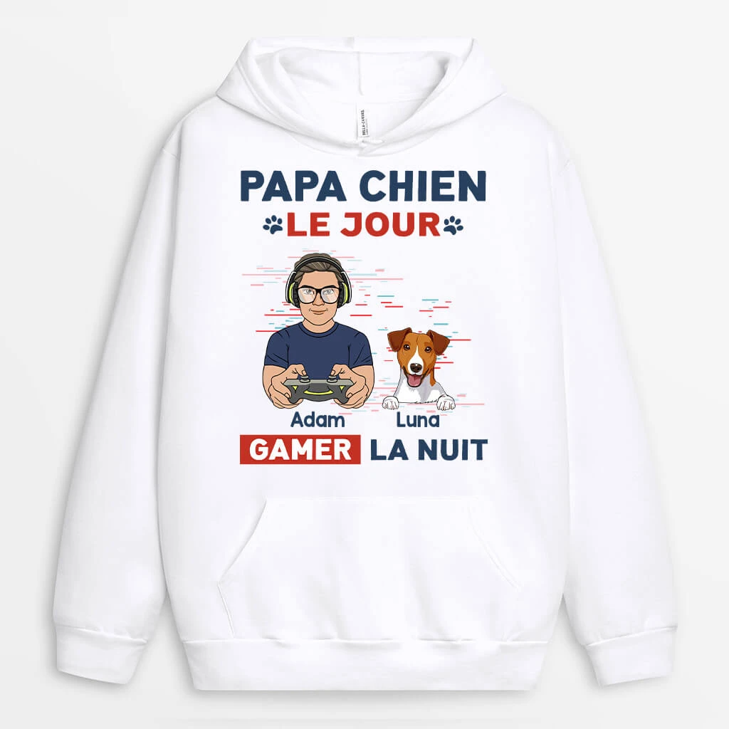 Sweat à Capuche Papa Chien Le Jour Gamer La Nuit Personnalisé
