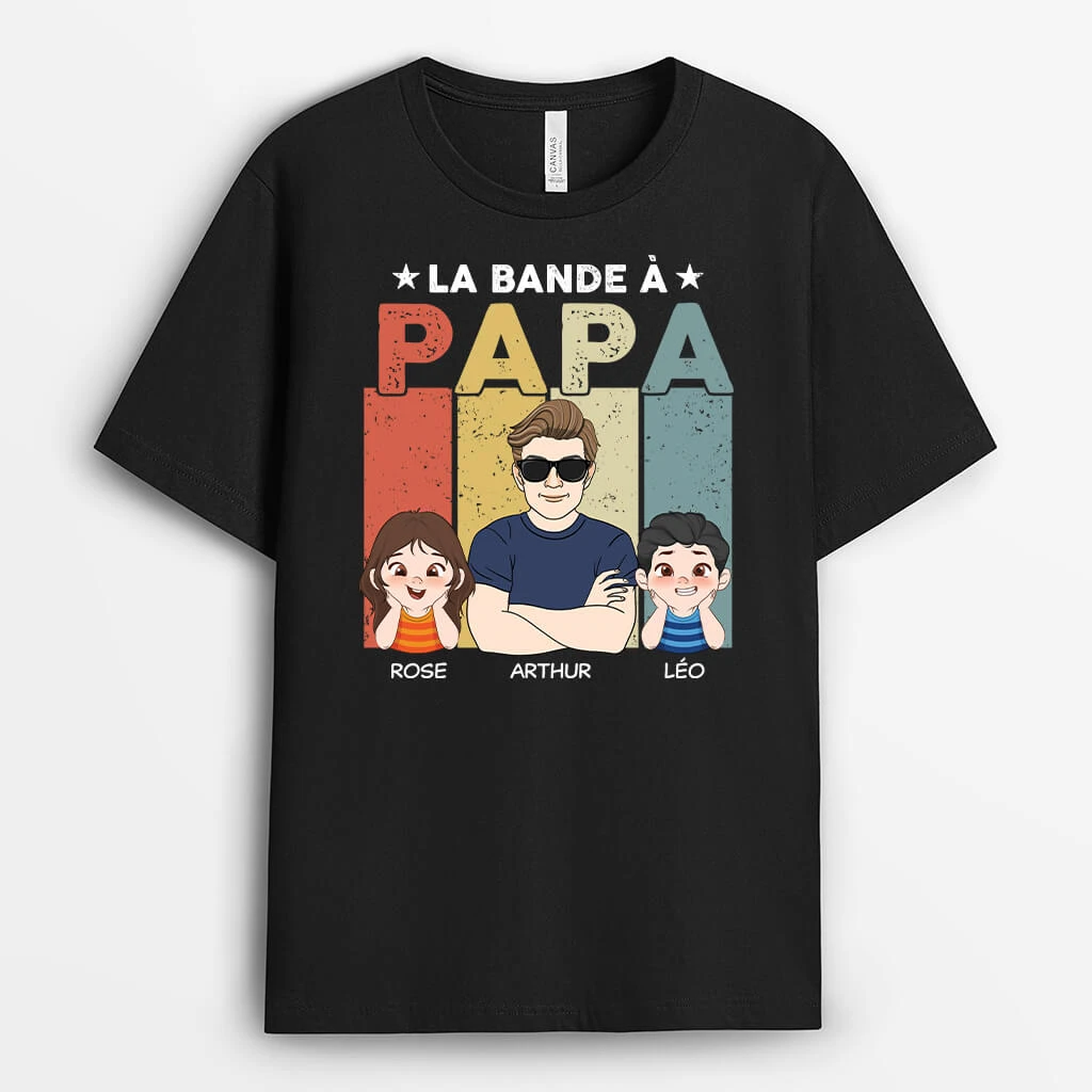 Faites un clin d’œil stylé à la « bande à Papa » avec ce T-shirt unique ! Ce cadeau personnalisé papa présente un design amusant de Papa arborant des lunettes stylées, entouré de ses enfants. Personnalisez-le avec les prénoms de sa « bande » pour un cadeau personnalisé pour papa qui combine humour et originalité.