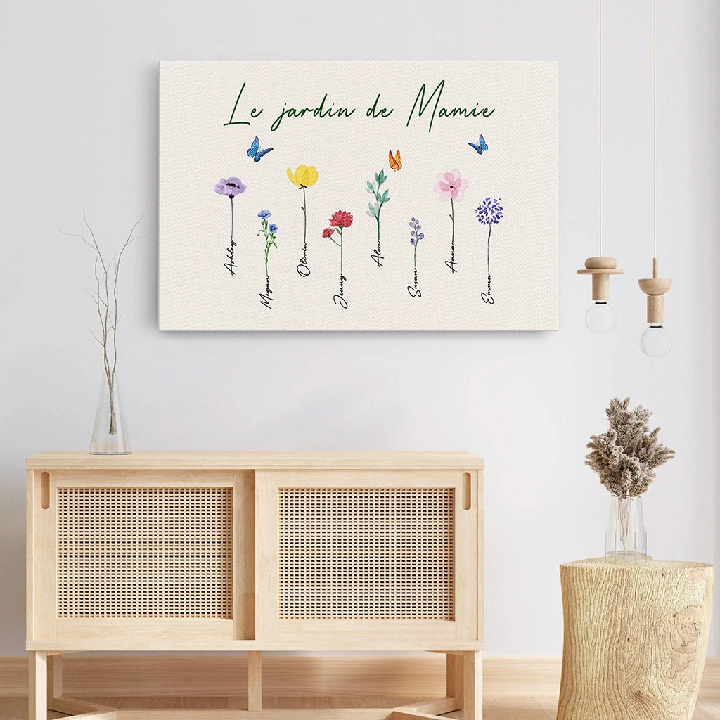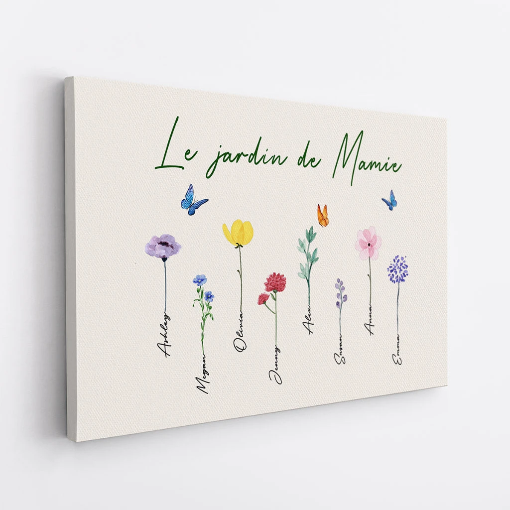 Offrez à Mamie un jardin qui ne fane jamais avec cette toile personnalisée jardin mamie, où chaque petit-enfant devient une fleur portant son prénom. Parfait pour célébrer la Fête des Grands-Mères/Mères, son anniversaire ou seulement pour montrer votre amour.