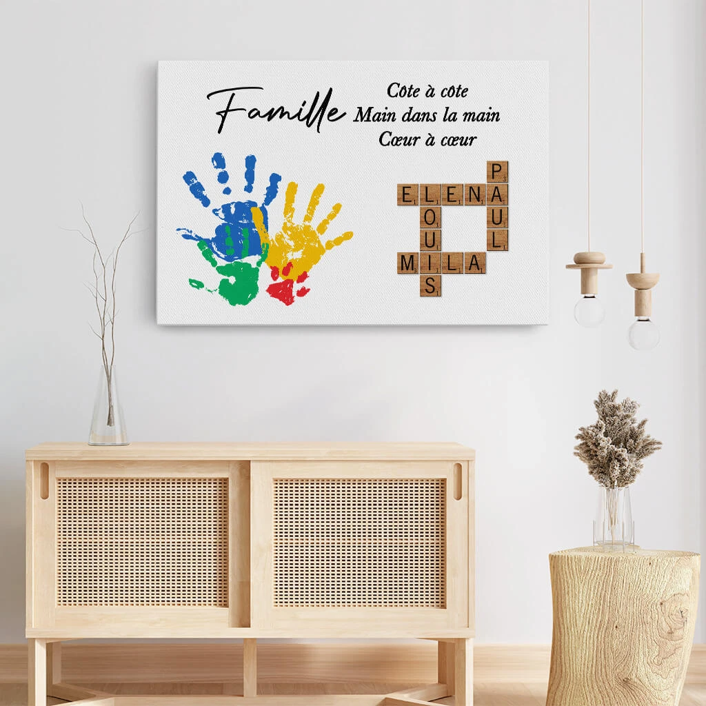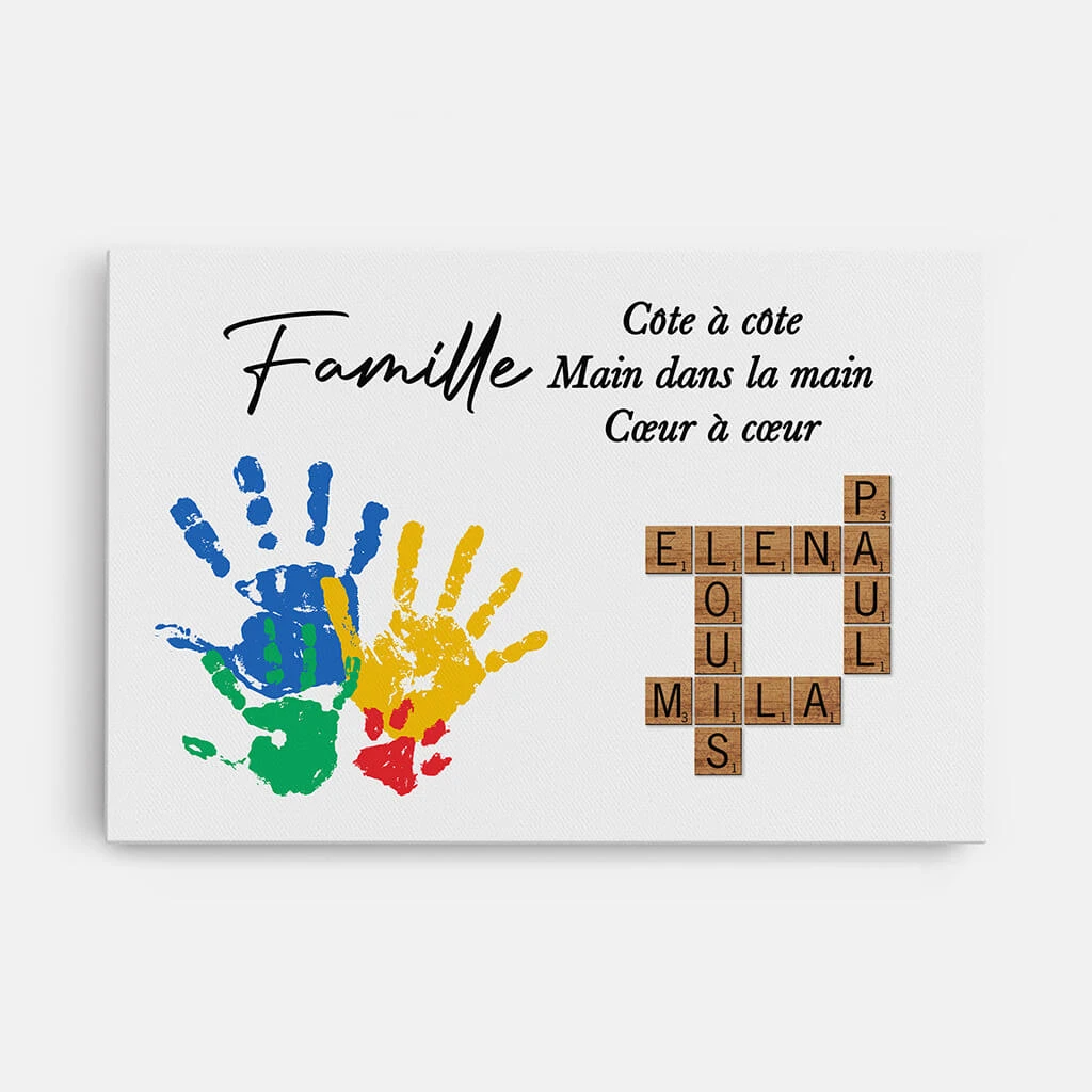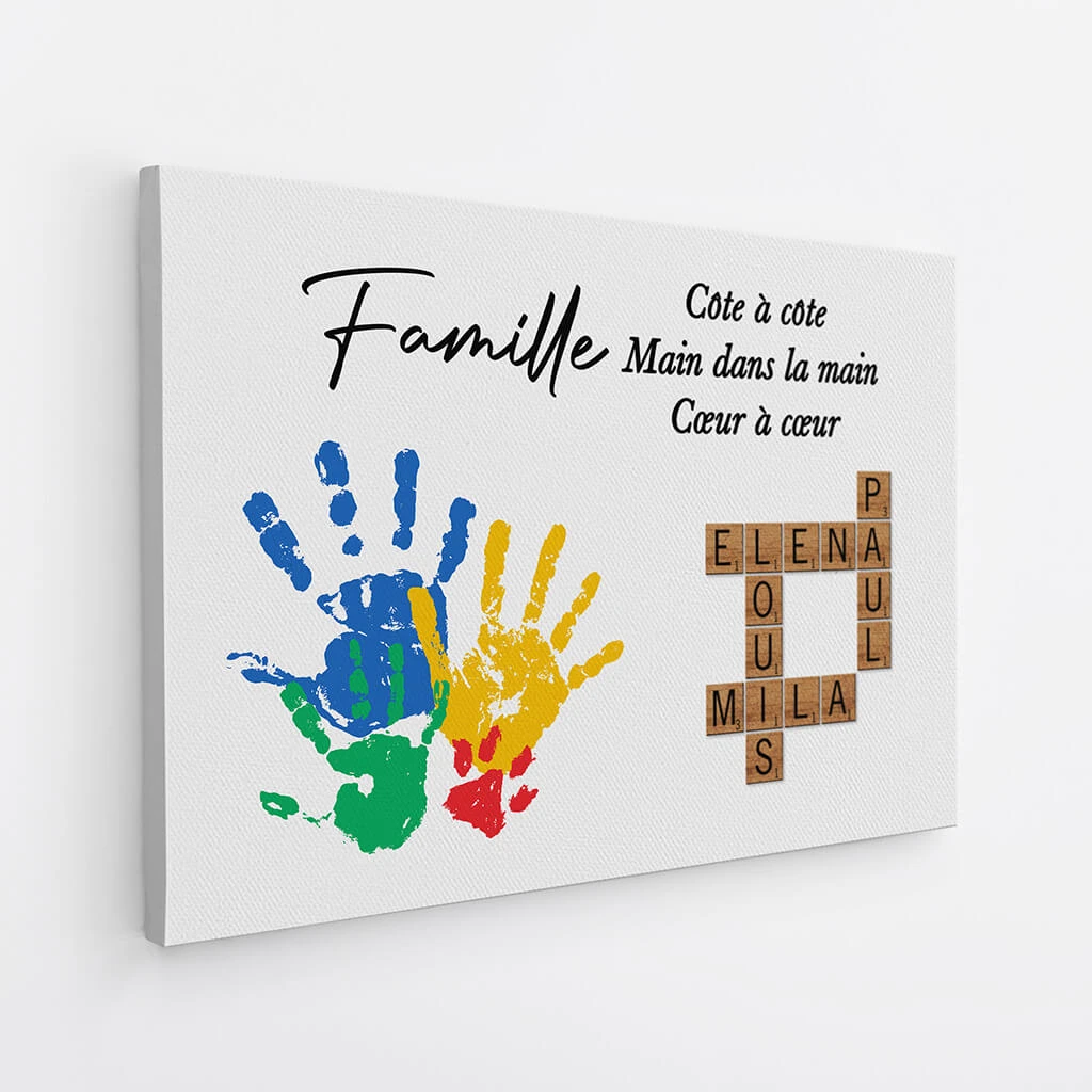 Cette toile originale associe mots croisés prénoms famille et empreintes digitales pour créer une œuvre unique et profondément personnelle. Chaque prénom trouve sa place dans une grille sur mesure, accompagnée de touches graphiques symbolisant l’union familiale. Un cadeau parfait pour mettre en valeur les liens du cœur à l’occasion d’un anniversaire, d’une crémaillère ou des fêtes de fin d’année.