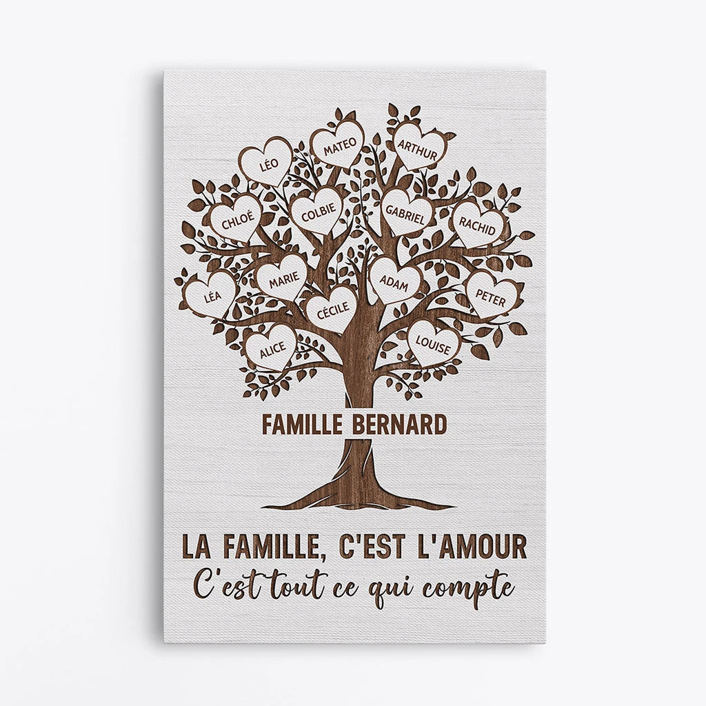 Cette toile famille personnalisé représente un arbre de vie en forme de cœur avec les prénoms des membres de la famille. Cette toile arbre de vie personnalisé prénom est idéale comme cadeau de Noël, anniversaire, ou fête des grands-parents, et s’intègre naturellement dans n’importe quel intérieur chaleureux.
