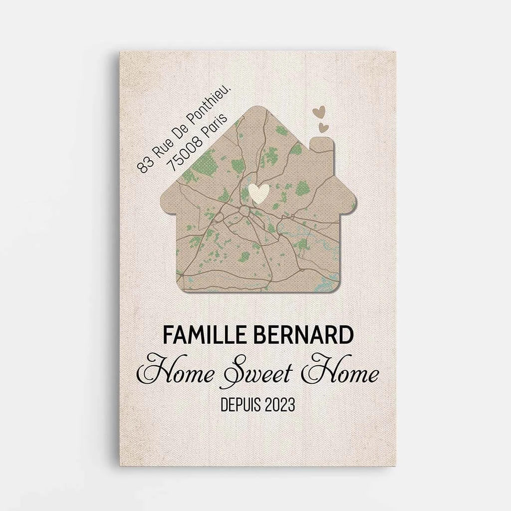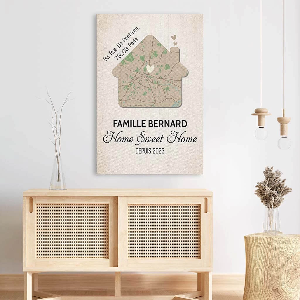 Cette toile personnalisée famille célèbre l’histoire de votre foyer avec le message “Home Sweet Home depuis…”, accompagné des prénoms de chaque membre. Avec son design sobre et élégant, elle s’intègre parfaitement à tous les intérieurs et devient un cadeau famille personnalisé chargé de sens.